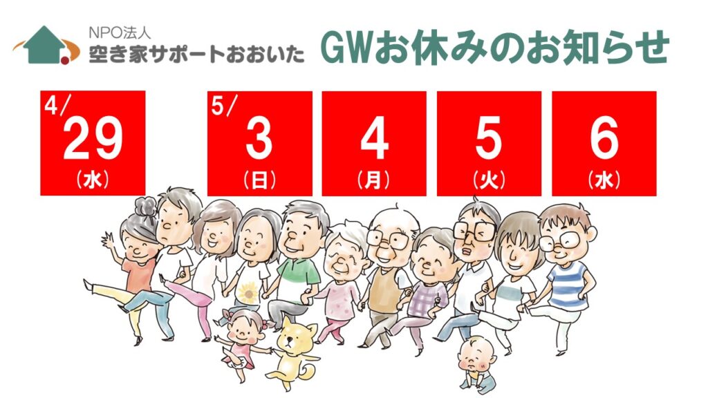 空き家サポートおおいたGWお休みのお知らせ お知らせ Twitter Facebook はてブ Pocket LINE コピー 2026.04.16 NPO法人空き家サポートおおいたのワンストップ相談窓口、県下相談窓口エリア拠点、及び事務局はゴールデンウィーク期間、4/29(水)、5/3日(日)~5/6(水)はお休みとなりますので、お電話対応はできません。また、メールでのお問い合わせにつきましては、ご回答が5月7日以降となりますのでご了承ください。 NPO法人空き家サポートおおいた